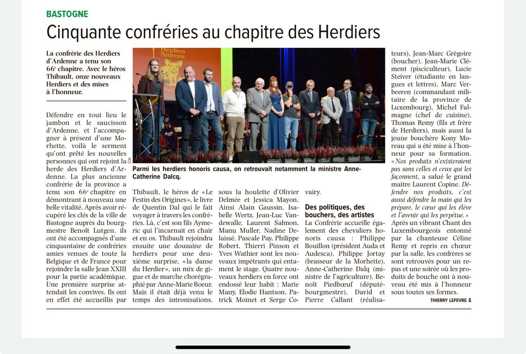 C’est ainsi qu’est née en 1962 la Confrérie des Herdiers d’Ardenne, avec pour mission de défendre et promouvoir un produit emblématique : le jambon d’Ardenne, dont Bastogne est un haut lieu de fabrication. Mais au-delà de la gastronomie, la confrérie s’est aussi engagée à valoriser le patrimoine et l’identité ardennaise.